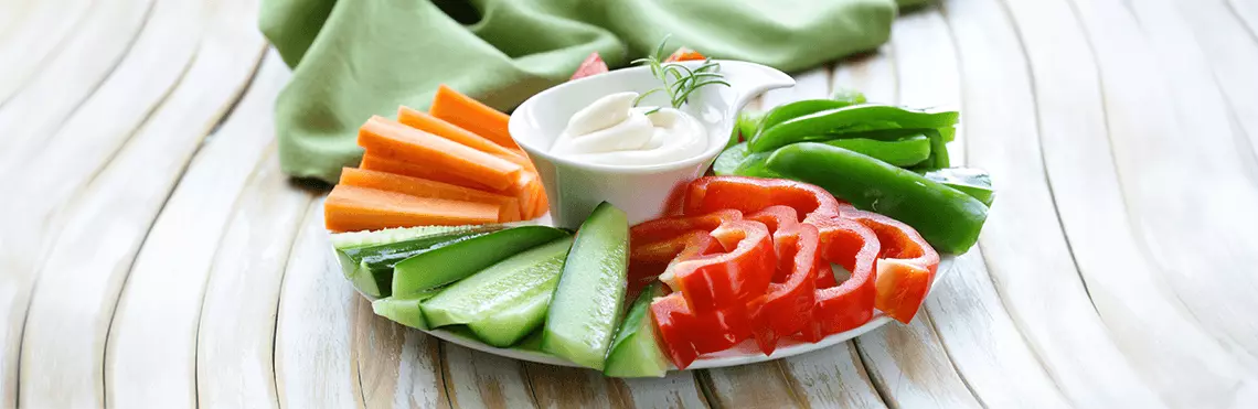 Warzywne słupki ułóż na talerzu obok miseczki z hummusem. Podawaj jako zdrową i chrupiącą przekąskę.