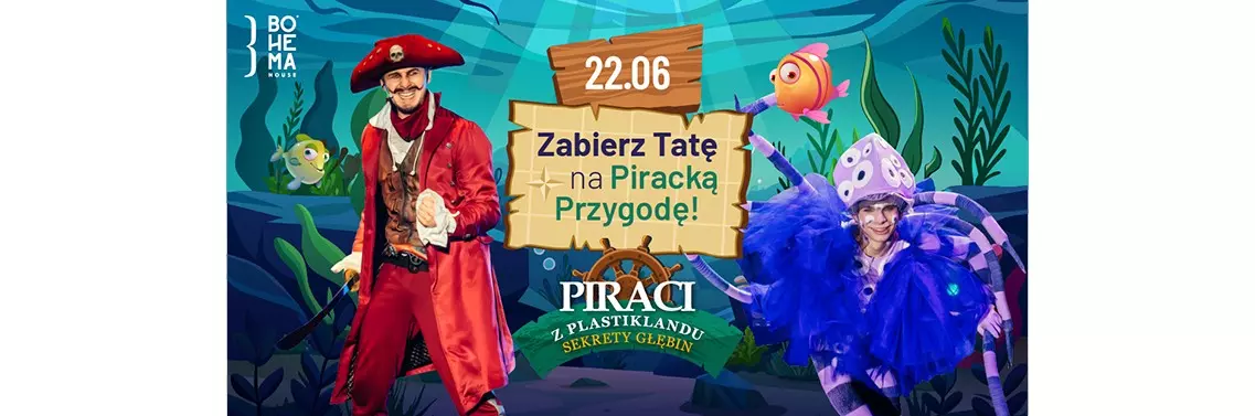 Wyjście z domu to okazja, aby poznać się lepiej, przeżyć przygodę i stworzyć wspólne wspomnienia. 22 czerwca, czyli w niedzielę poprzedzającą Dzień Ojca Teatr Bohema House zaplanował spektakl “Piraci z Plastiklandu. Sekrety głębin”. To jeden z absolutnych hitów, wybieranych chętnie przez publiczność ze względu na żywą muzykę, spektakularną scenerię pirackiego statku i podmorskich głębin oraz - co jest znakiem wyróżniającym Bohema House - zapierające dech w piersiach akrobacje powietrzne. Specjalnie ten bardziej “męski” spektakl z repertuaru teatru został wybrany na tę okazję. Ale bawią się na nim zawsze znakomicie widzowie obojga płci.