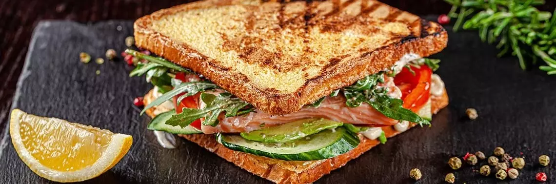 - Dwa tosty wyłóż wędzonym łososiem, rukolą, plastrami ogórka, pomidora i przykryj dwoma pozostałymi kromkami chleba.